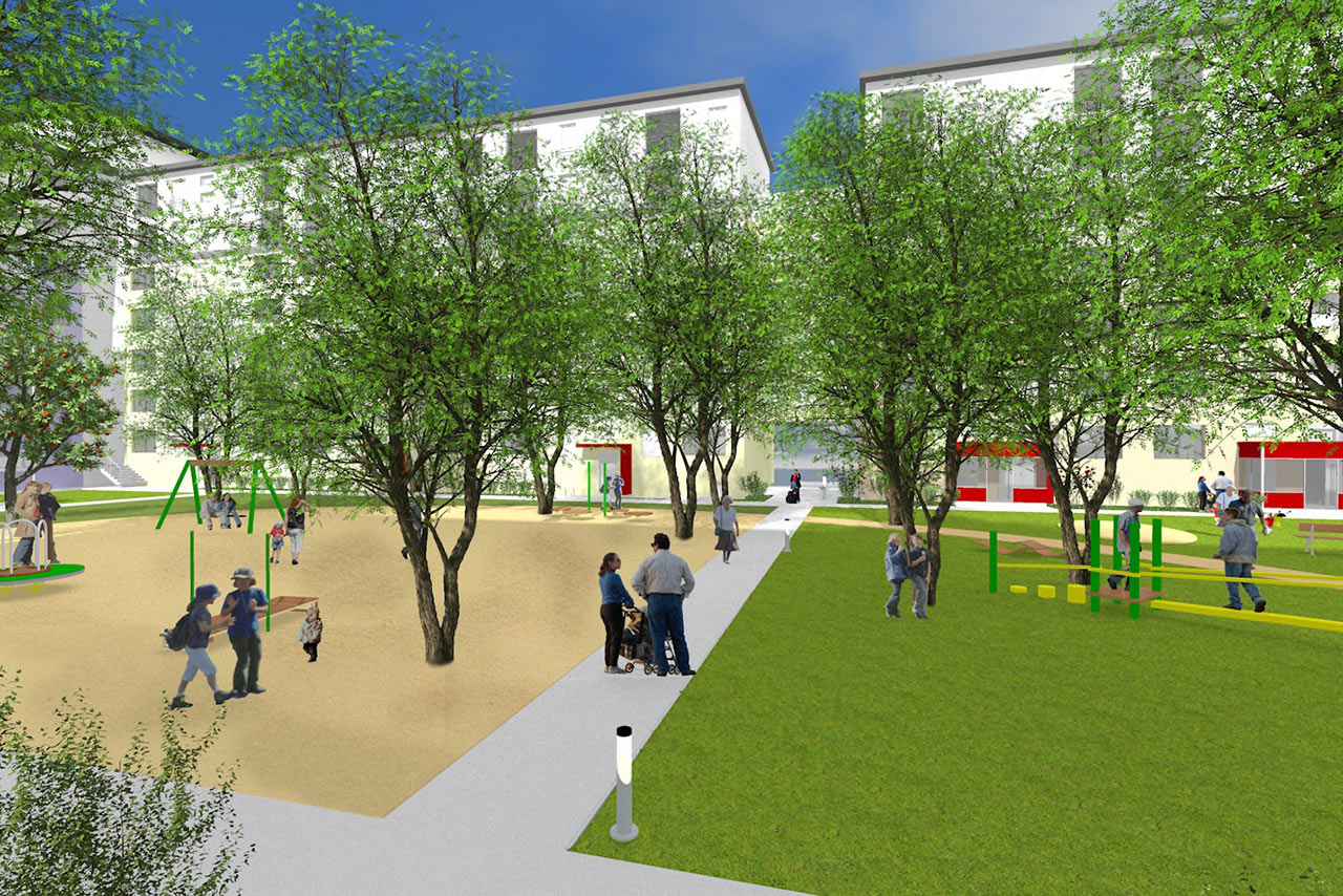 Die Quartiergestaltung mit dem Motto „GRÜNERLEBEN“ gestattet ein „Grüner Leben“, in dem die Bewohner das „Grün erleben“ können in Form von gestalteten Außenanlagen für Erholung, Sport und Spiel für ein gemeinsames Miteinander zwischen Jung und Alt.
